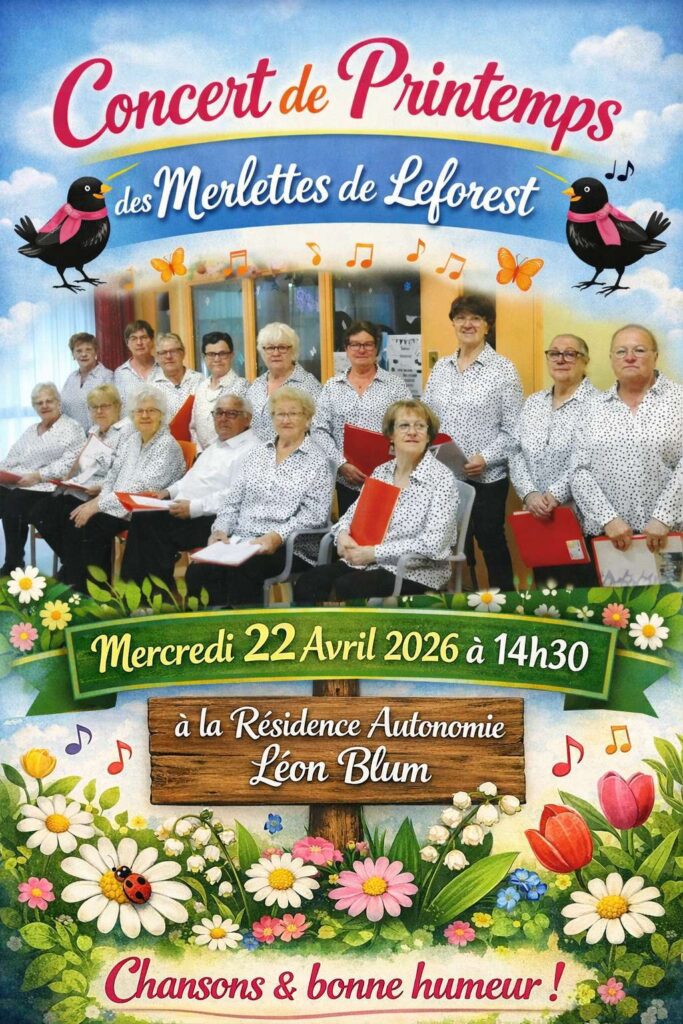 Les Merlettes de Leforest vous invitent à leur concert de printemps qui aura lieu le mercredi 22 avril à 14h30 à la Résidence Autonomie Léon Blum. Entrée gratuite.