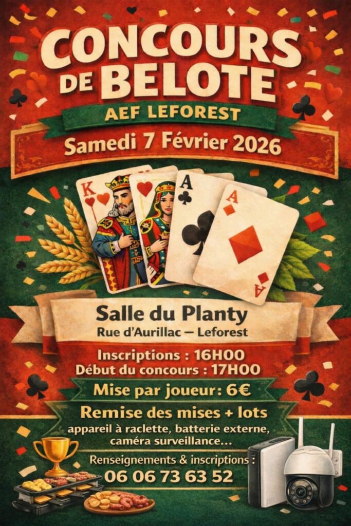 Le club de football organise un concours de belote le samedi 7 février à 16h00 à la salle Roland et Lucienne Prévost, rue d’Aurillac.