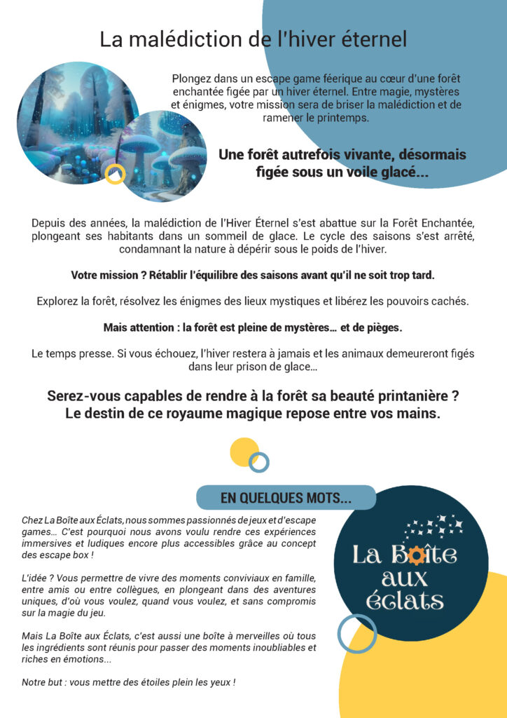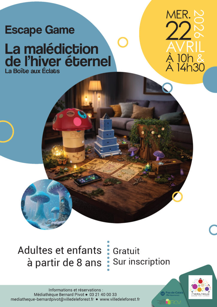 La médiathèque vous propose un Escape Game sur le thème de l’hiver, le mercredi 22 avril à 10h00. Gratuit – Public adultes et enfants à partir de 8 ans – Sur réservation au 03 21 40 00 33.