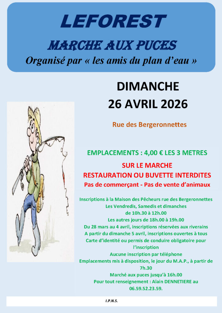 L’association Les Amis du plan d’eau organise un marché aux puces le dimanche 26 avril de 8h00 à 16h00, rue des Bergeronnettes.